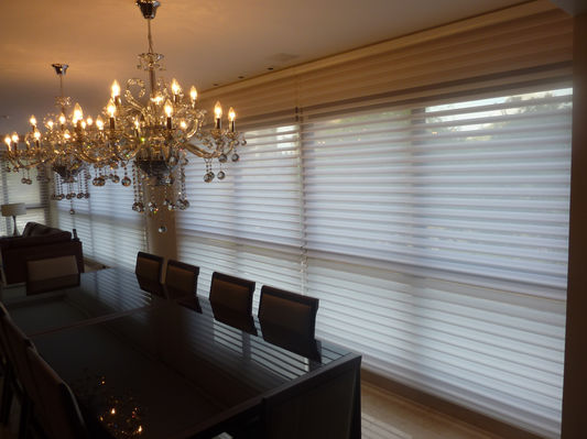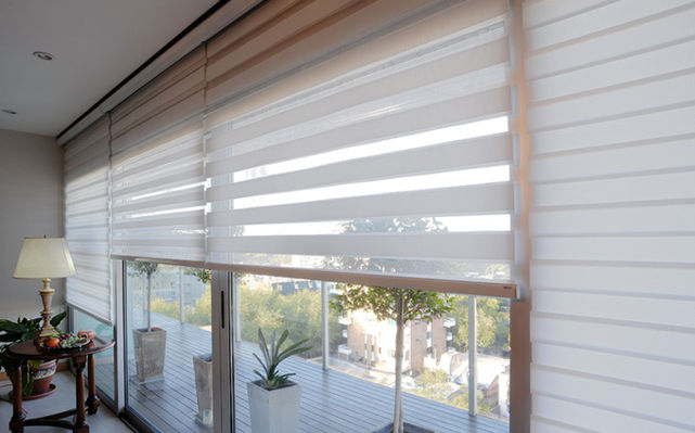 Es una cortina de doble tela, de bandas horizontales y tramas alternadas que cumplen la función de otorgar transparencia y privacidad, según la posición en que se encuentre.